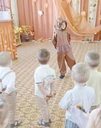 Своей веселой песней «Мишка- мишенька» детки разбудили медведя, подарили ему бочонок меда и исполнили танец «Хохломские ложки».